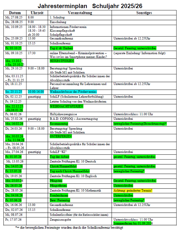 Jahresterminplan Schuljahr 2025/ 26